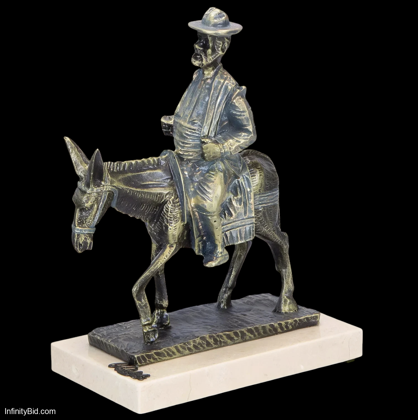 Artisanal Mastery from Spain Each sculpture is meticulously handcrafted in Spain using artificial stone and finished with a rich, bronze patinated layer. This specialized technique gives the pieces the weight and timeless look of traditional bronze while allowing for incredible detail in the textures of the clothing, the weary expressions of the riders, and the character of their mounts. To ensure authenticity, each piece features the engraved signature of the Spanish artist on a dedicated plaque at the base.
