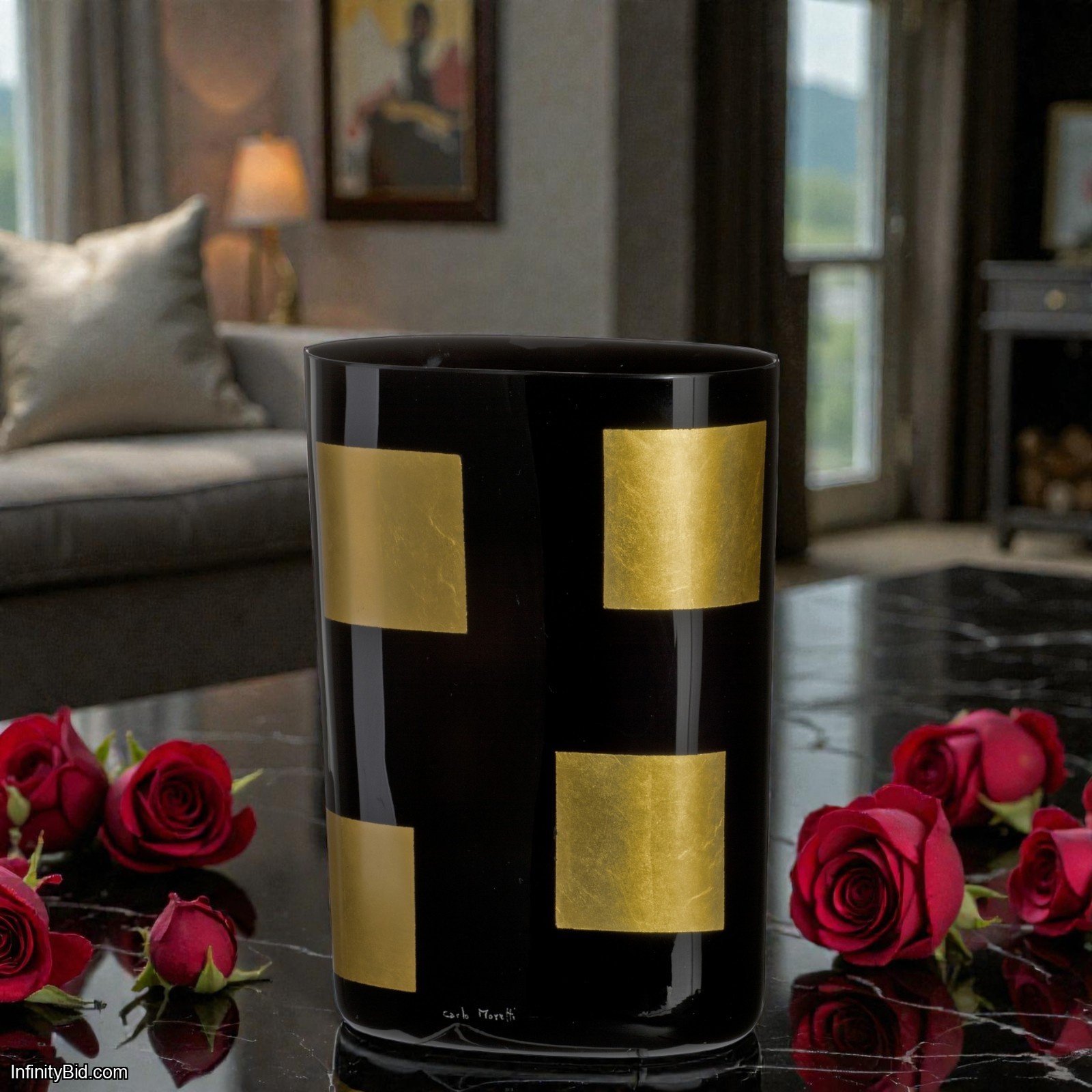 Expertly handcrafted in Murano, Italy, this oval vase is made from deep black Murano crystal and adorned with hot-applied, square-shaped tesserae in pure zecchino gold leaf. Each piece reflects Carlo Moretti’s mastery of traditional glassmaking techniques combined with contemporary artistic vision.