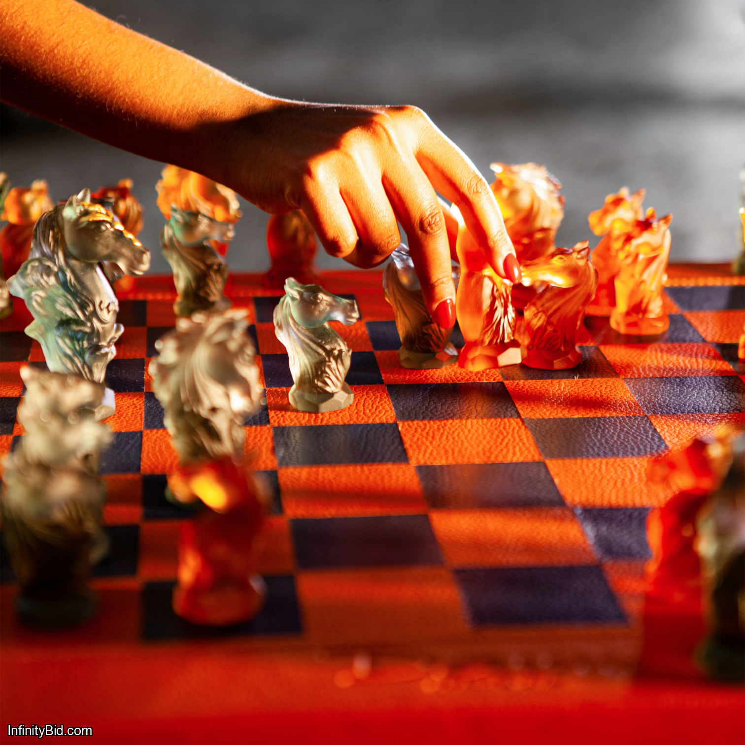A Masterpiece of French Artisanal Heritage This is not merely a game; it is an architectural statement. The set features hand-sculpted crystal pieces that play with colorful transparencies and light. The King and Queen stand at an imposing 11 cm, their crowns delicately enhanced with genuine gold leaf. The battlefield is a bespoke leather board crafted by the legendary Parisian house Hector Saxe, featuring intricate marquetry in orange and navy blue leather. Every detail, from the gold-plated handles to the hidden storage compartment, radiates a level of luxury rarely seen in the world of high-end gaming.