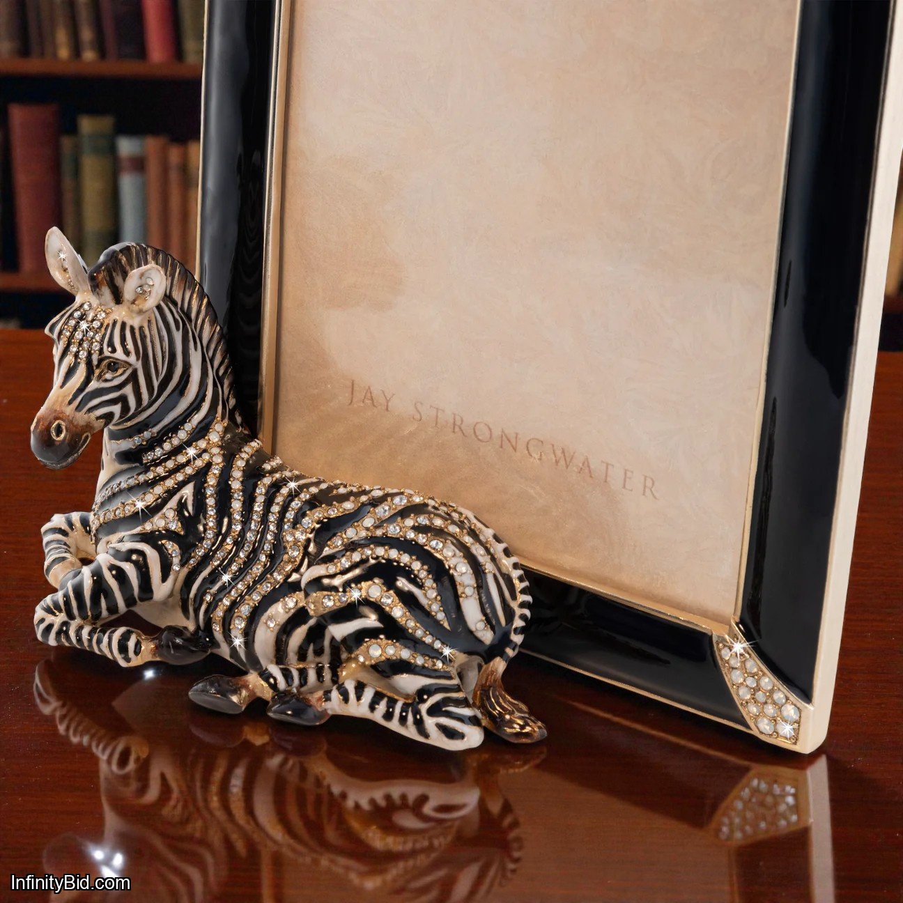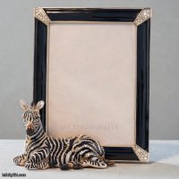 A retired and highly limited Jay Strongwater design, the Benton Zebra Frame brings bold artistry to your most cherished photographs. The striking zebra motif is paired with deep black enamel and accented by four jeweled corners set with rich, jewel-toned Swarovski crystals. A collectible piece that elevates any space with refined glamour.