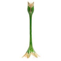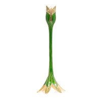The Ambrosius Tulip Tall Green Candlestick Holder by Jay Strongwater is a stunning decorative statement inspired by the graceful form of a blooming tulip. A stylized flower rises from a sculpted leaf base, all hand-enameled in translucent fern-green hues that glow beautifully when illuminated by candlelight.