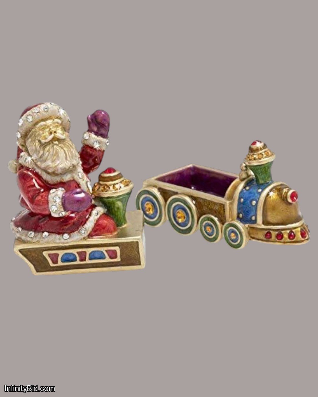 The Annual Holiday Box 2019 – Santa on a Train by Jay Strongwater is a charming and intricately crafted decorative box that celebrates the joy and nostalgia of the holiday season. Designed as a beautifully detailed old-fashioned train carrying Santa Claus, this collectible piece opens to reveal a hidden compartment lined in rich swirled purple enamel, perfect for storing small treasures, jewelry, or holiday mementos.