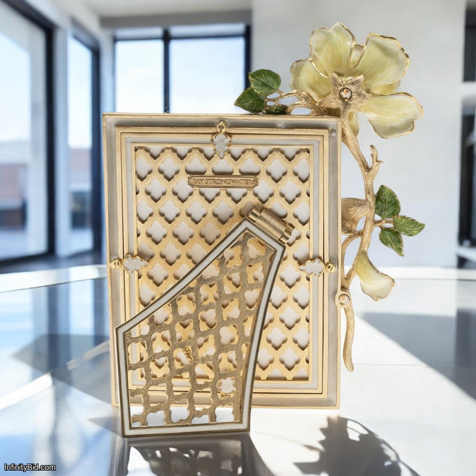 Artisanal Craftsmanship from Rhode Island Each frame begins as a full dimensional carving of a rose, which is cast in solid pewter and finished in luxurious 14K Gold. The frame is then washed in a delicate layer of cream enamel, allowing the intricate golden floral pattern beneath to shine through with a sophisticated glow. Master artisans in Jay Strongwater’s Rhode Island workshop hand-paint each rose with layers of translucent white and pale golden enamels, finishing the piece with hand-set opal-shaded Swarovski crystals.