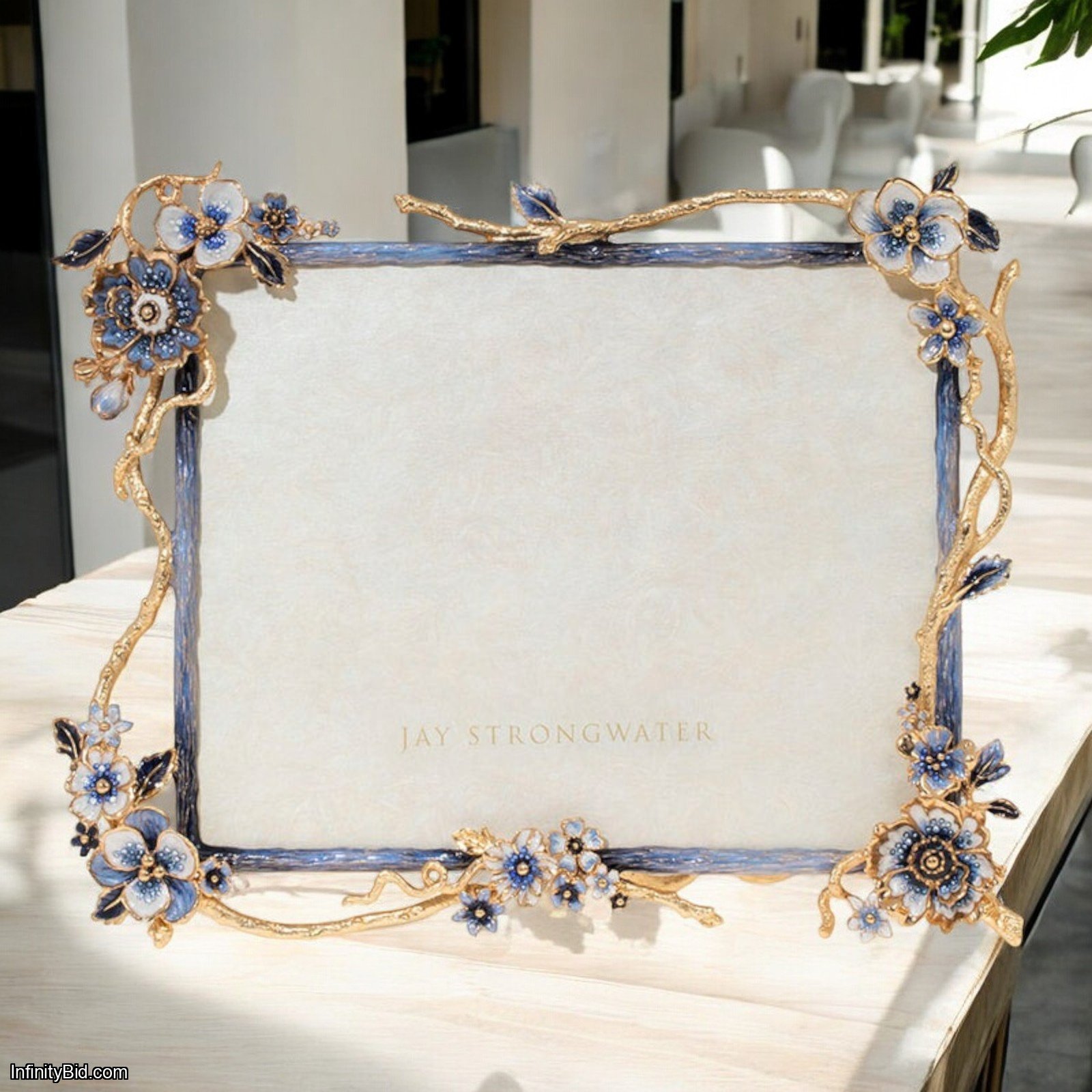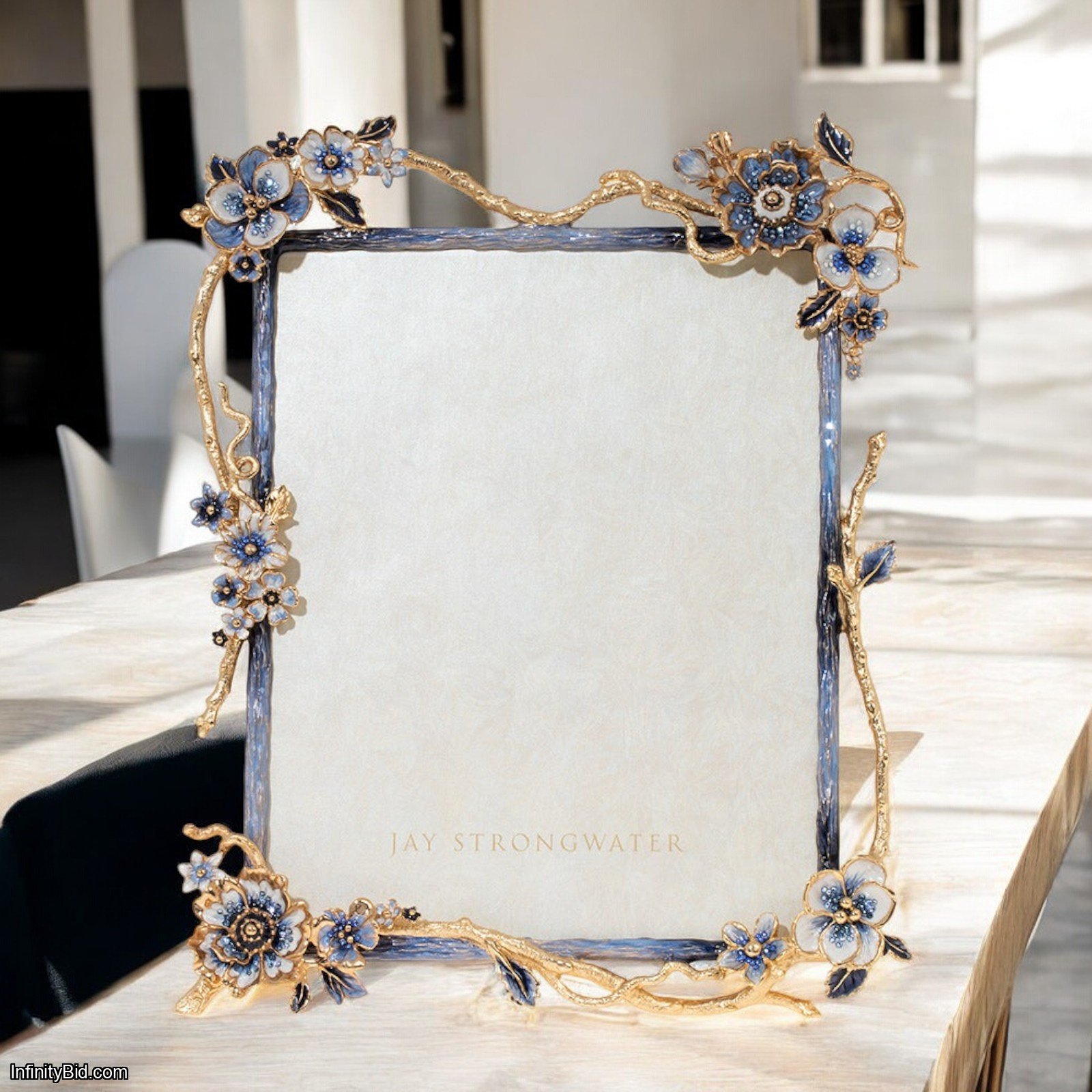 Inspired by the painted florals found on classic navy-and-white Chinese porcelain, the Jay Strongwater Delilah Floral Branch Frame – Delft Garden is a striking fusion of historic elegance and modern craftsmanship. Gracefully carved metal twigs and blossoms surround the frame, creating a delicate botanical composition that feels both timeless and refined.