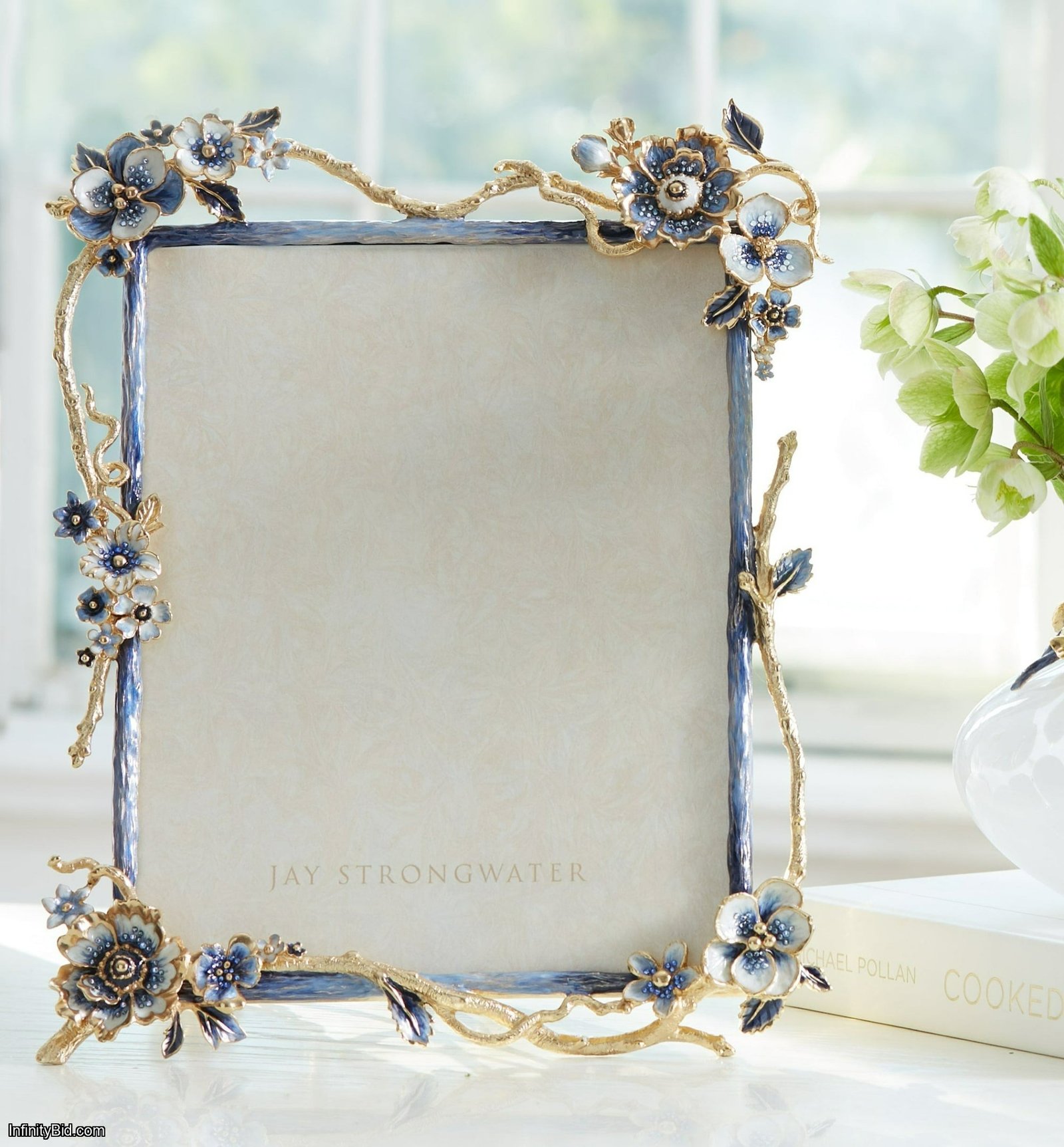 Cast in pewter and finished in luminous 14K gold, each floral petal is meticulously hand-painted in a sophisticated palette ranging from soft cream to deep cobalt enamels. Sparkling hand-set Swarovski® crystals in pale sapphire hues add a subtle brilliance, elevating this frame into a true decorative objet d’art.
