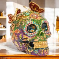 Product Overview The Jay Strongwater Rivera Skull With Butterflies Box is a breathtaking fusion of cultural heritage and high-fashion decor. Inspired by the rich history of Mexican sugar skulls, this piece serves as both a functional collectible trinket box and a masterpiece of jewel-toned artistry. The skull is intricately detailed with a raised floral pattern and adorned with fluttering, jeweled butterflies, capturing a spirit of celebration, memory, and transformation.