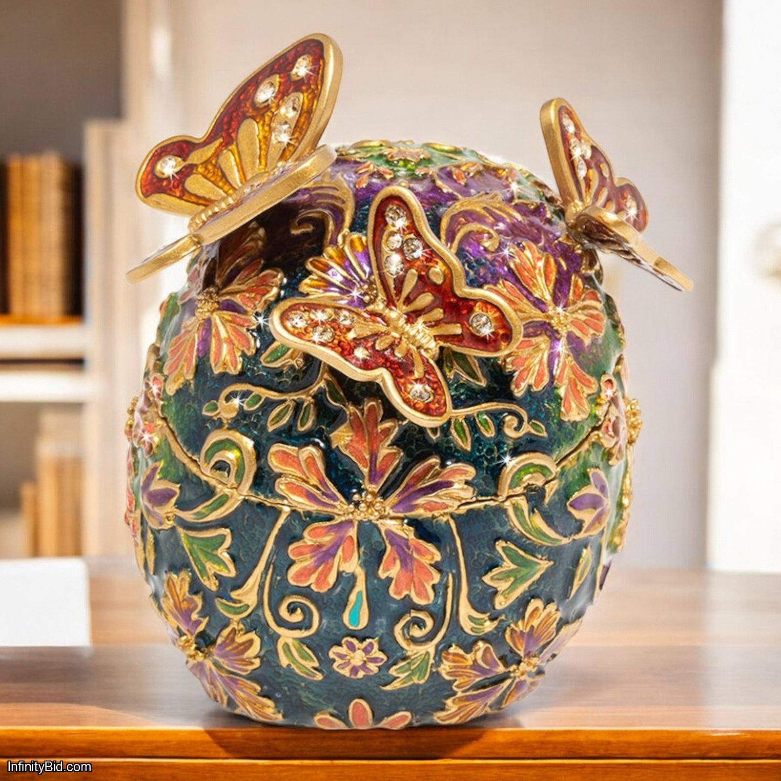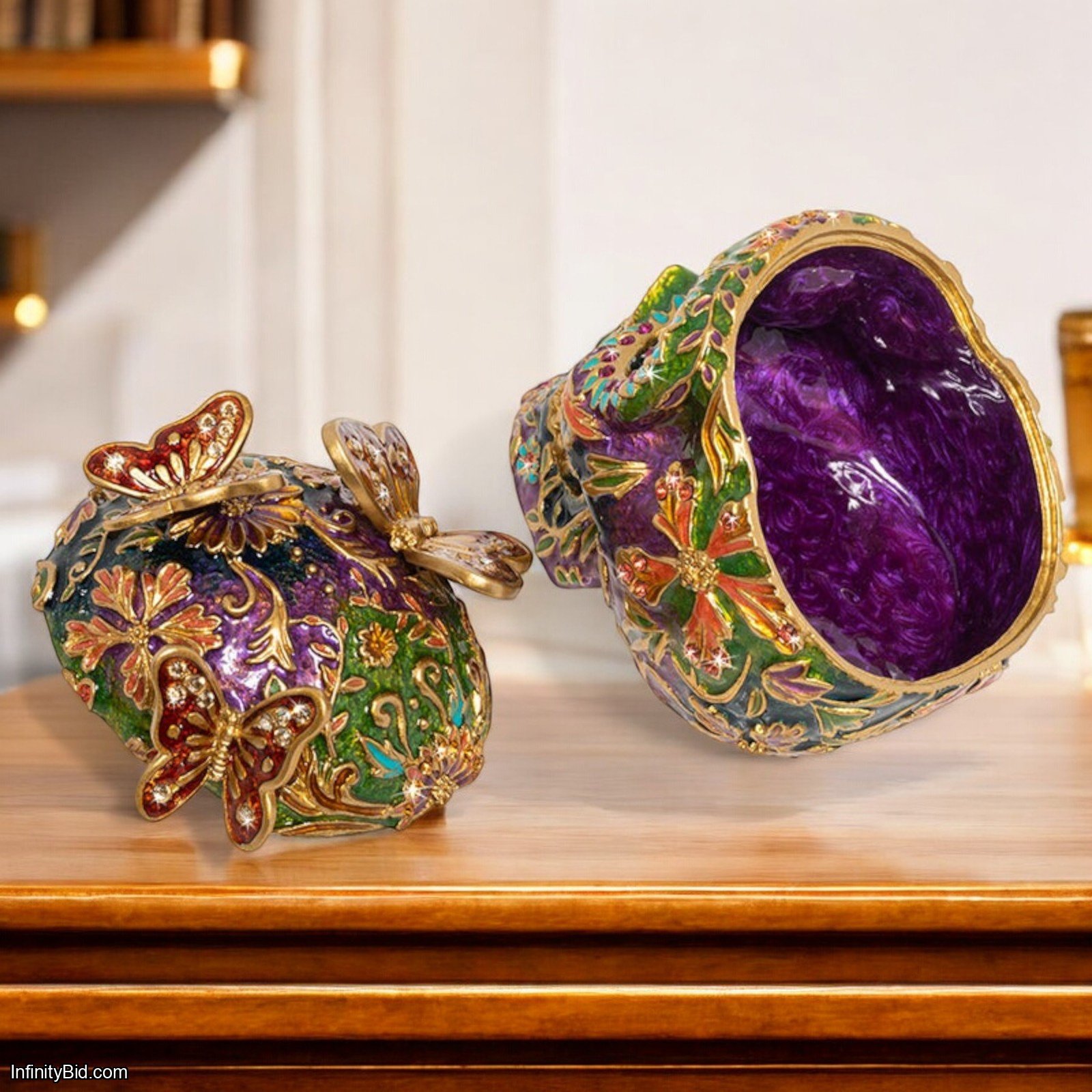 Jewel-Toned Enameling: Hand-painted in vibrant, jewel-tone enamels with a swirled purple enamel interior lining hidden beneath the lid.