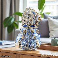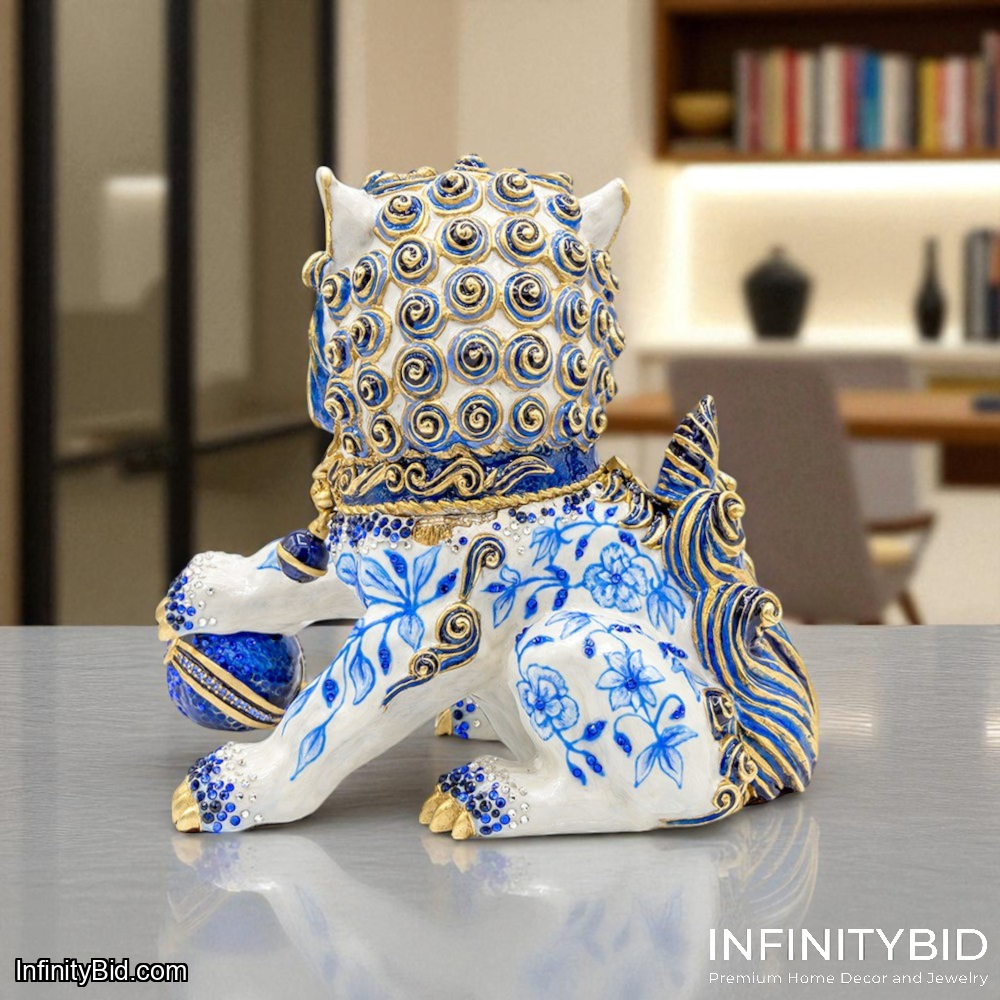 Make a bold and elegant statement with the Jay Strongwater Shi Foo Dog Chinoiserie Figurine, a breathtaking example of luxury craftsmanship and artistry. This stunning collectible is hand-enameled in eight rich shades of cream and blue, featuring freehand-painted floral details that showcase remarkable depth and precision.