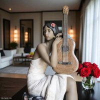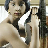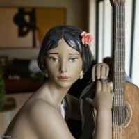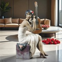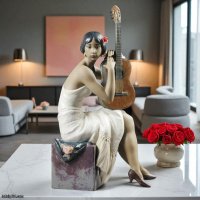 This stunning sculpture portrays a black-haired Spanish woman seated on a cube, with a guitar resting on her lap and a flower in her hair—a romantic symbol deeply rooted in the soul of Spain. Her elegant shawl, flowing dress, and poised presence exude passion and poise. The decorative cube base is adorned with colorful enamel accents, adding depth and vibrancy to the overall composition.