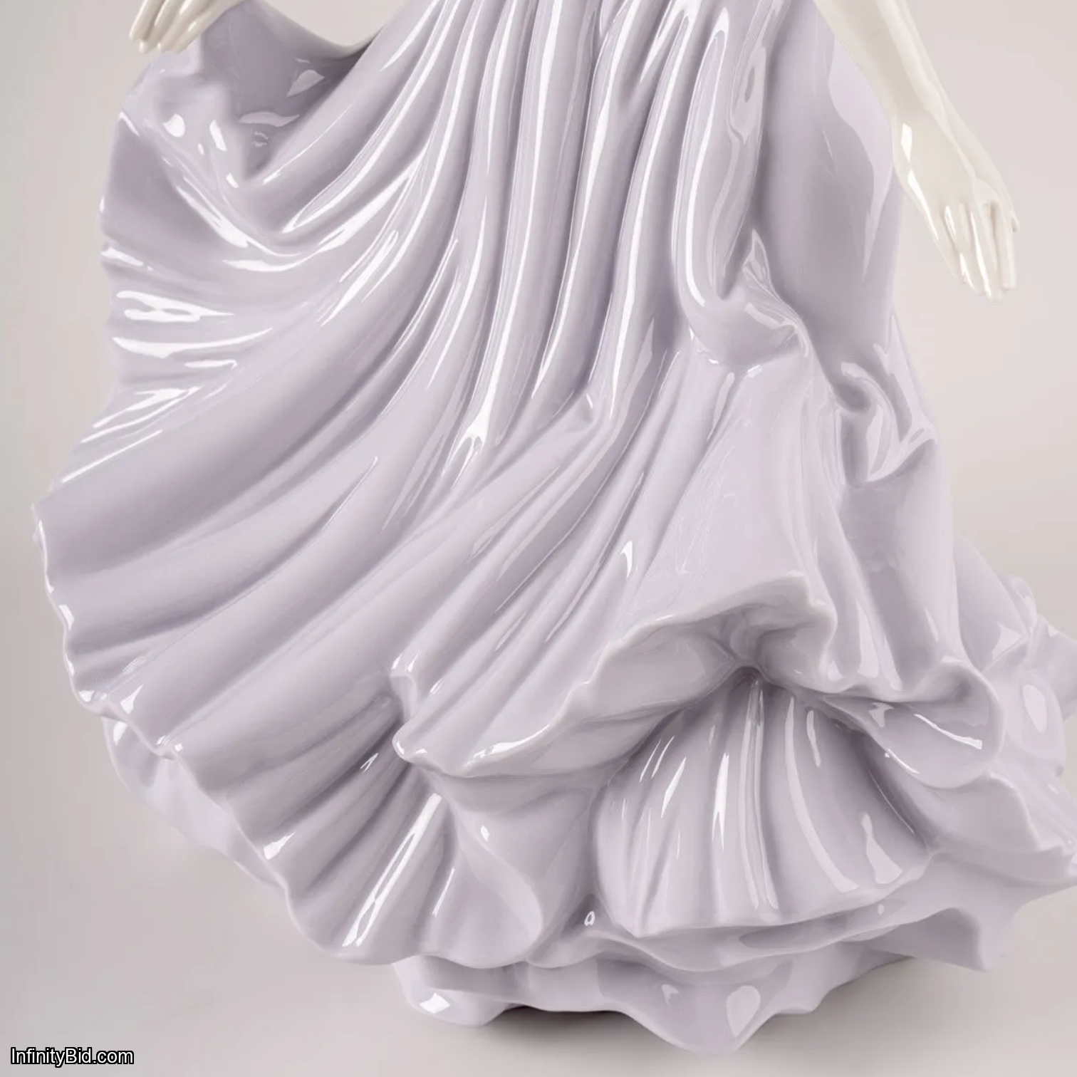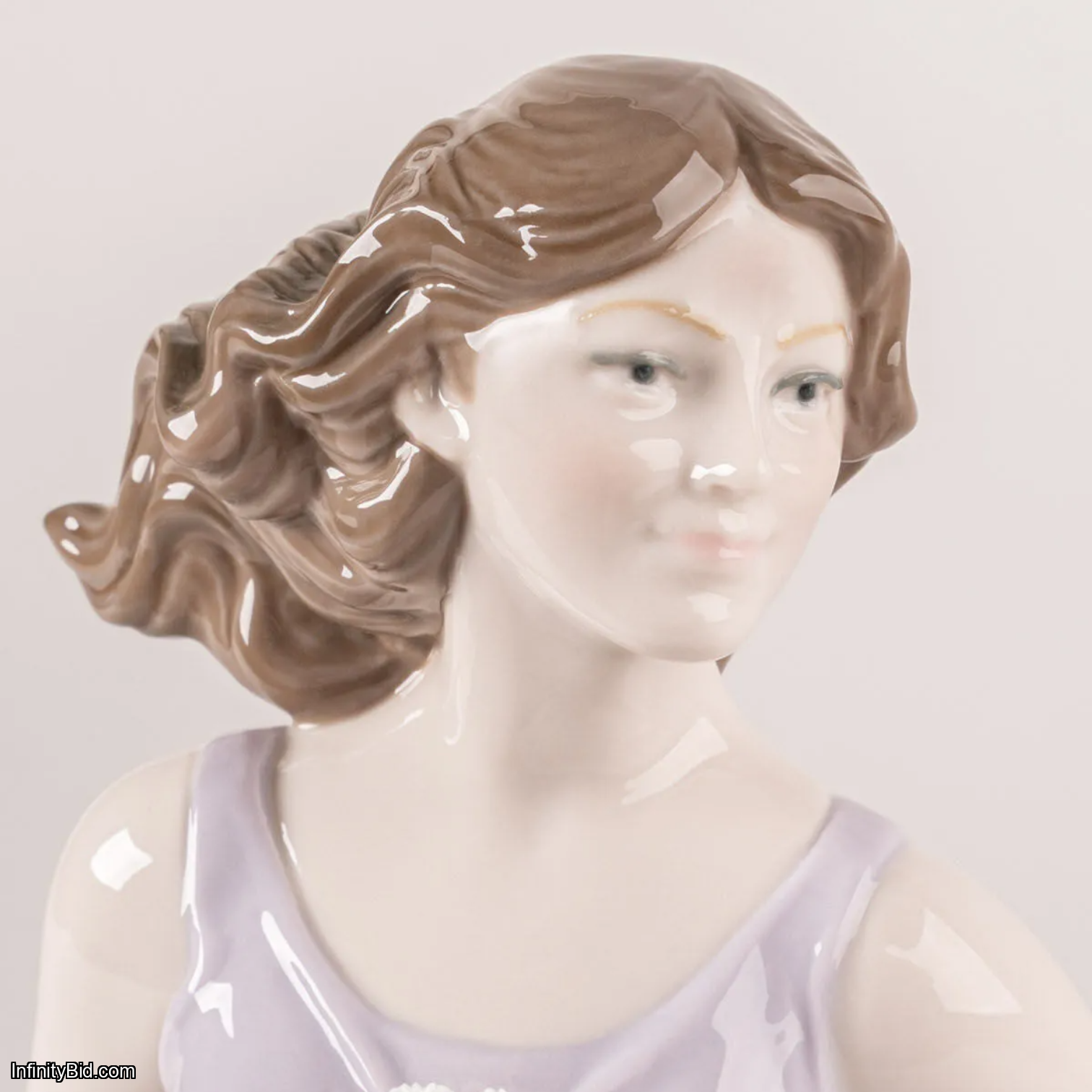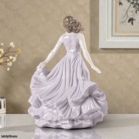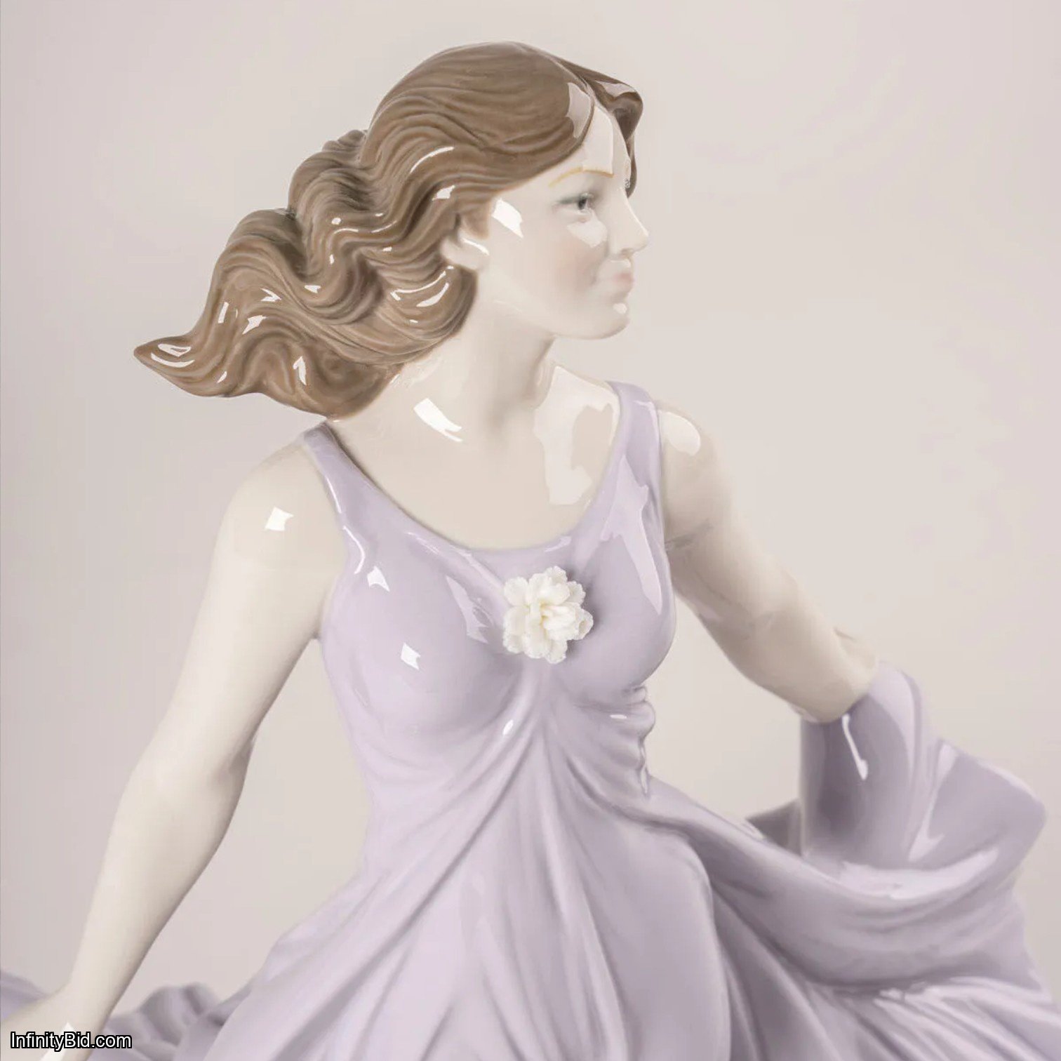 Her soft mauve, flowing dress expands with natural movement, creating a sense of lightness and visual rhythm. Crafted in glazed porcelain, the sculpture stands out for the delicate drapery of the fabric, with subtle folds and tonal nuances that interact beautifully with light from every angle. On her chest, the figure wears a handmade white carnation executed in matte porcelain, offering a refined contrast to the glossy finish of the dress.
