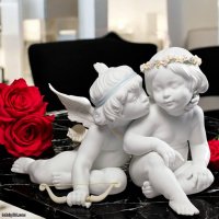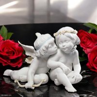 One angel lovingly holds the other's face, about to give a gentle kiss, while adorned with delicate pastel accents and a floral garland. Their playful innocence symbolizes the purity and beauty of love, making this sculpture a perfect gift or an elegant addition to any home or collection.