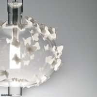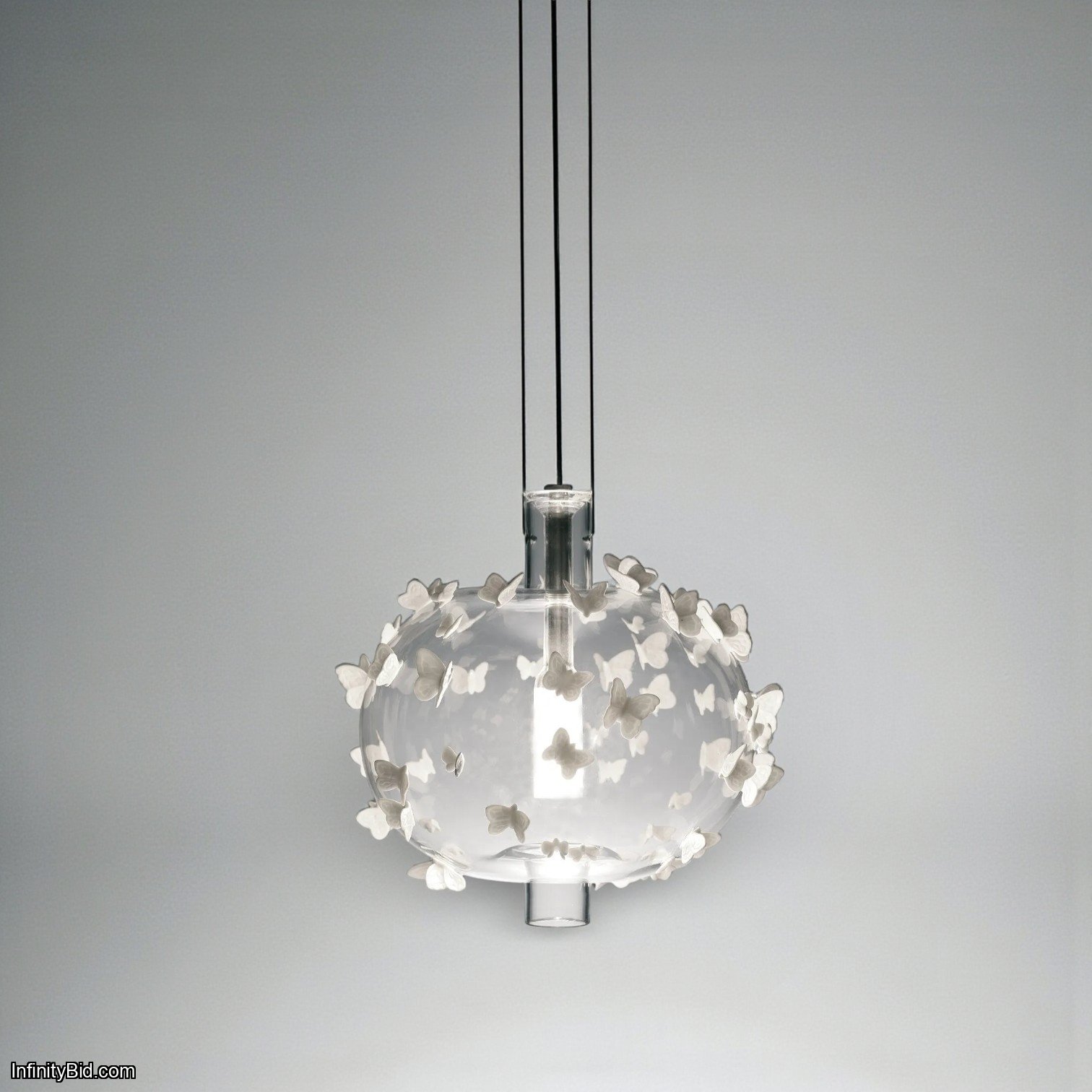 Artisanal Craftsmanship and Dramatic Lighting Each lamp is a unique creation, featuring a high-quality hand-blown glass sphere adorned with meticulously crafted porcelain butterflies. When the lamp is illuminated, it truly comes to life, casting theatrical butterfly shadows across your walls and ceiling. The soft, matte white finish of the porcelain provides a sophisticated contrast to the transparency of the glass, making it a stunning focal point even when the light is turned off.
