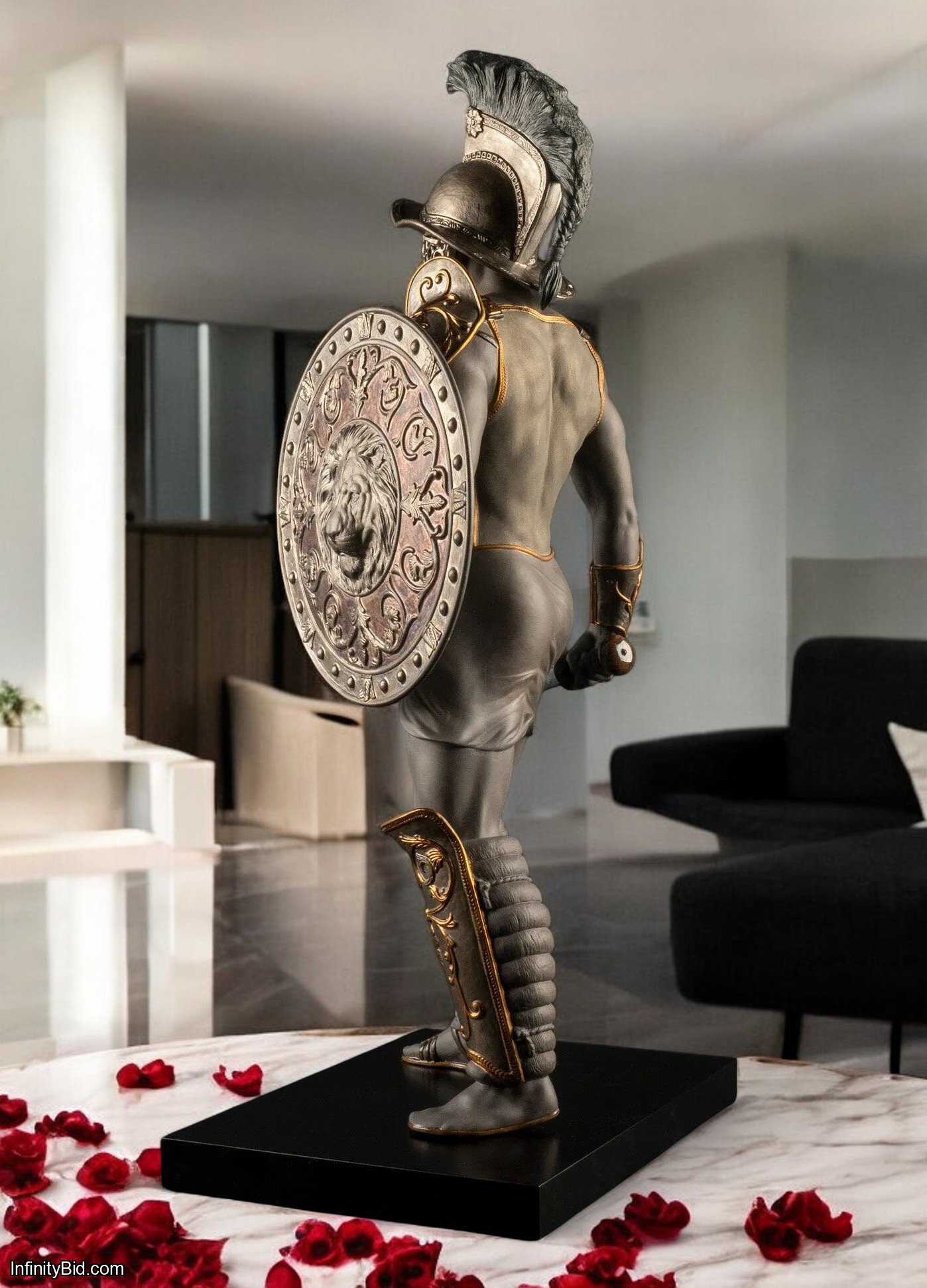 Crafted in matte black porcelain, the figure is expertly hand-decorated with copper, dark grey, and black enamels to create refined metallic effects across the armor and accessories. Aged silver luster accents enhance the helmet and armor surfaces, adding depth, contrast, and a noble patina. The shield features a distinctive black marble-effect luster, while the porcelain sword is finished to convincingly resemble forged metal.