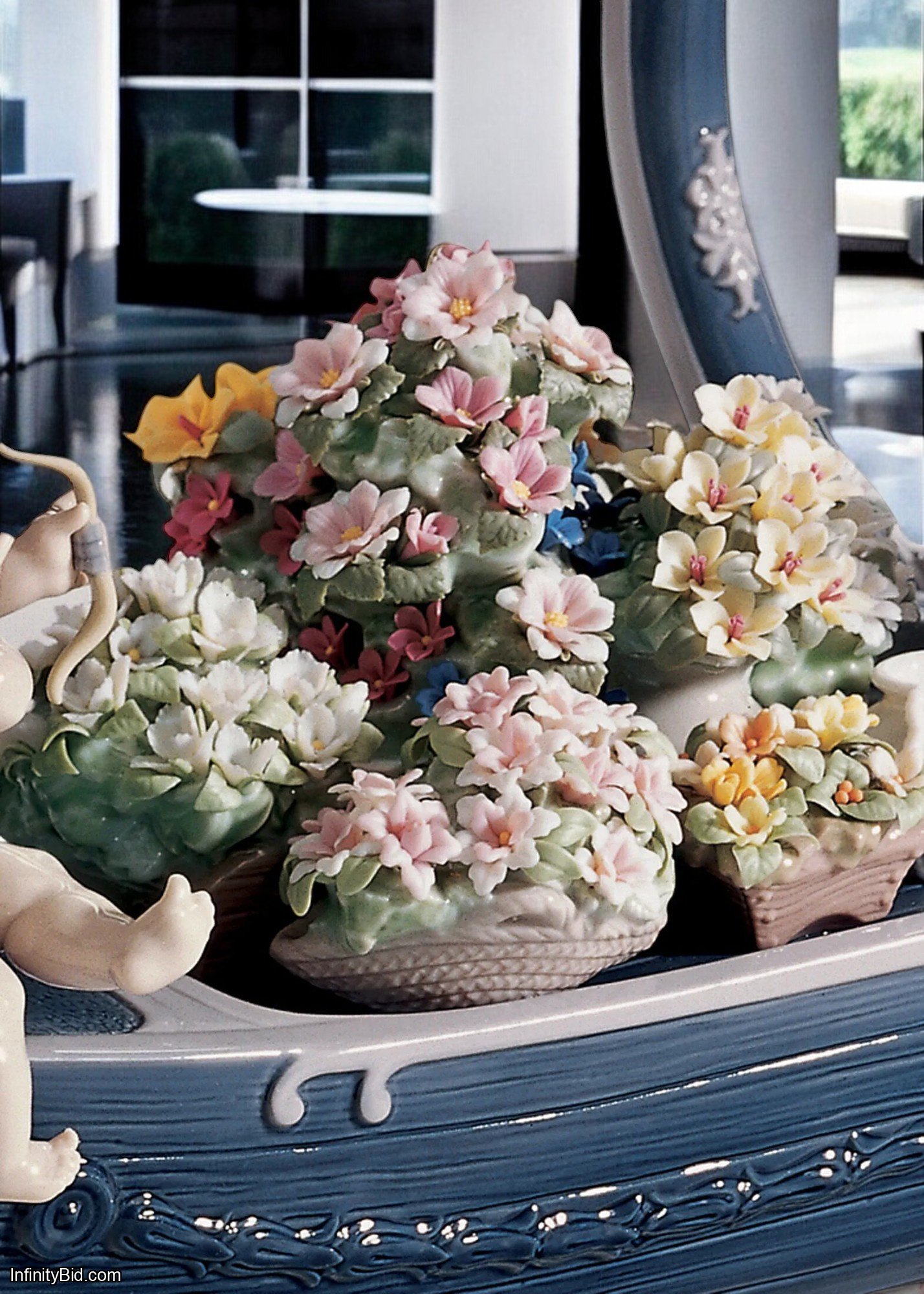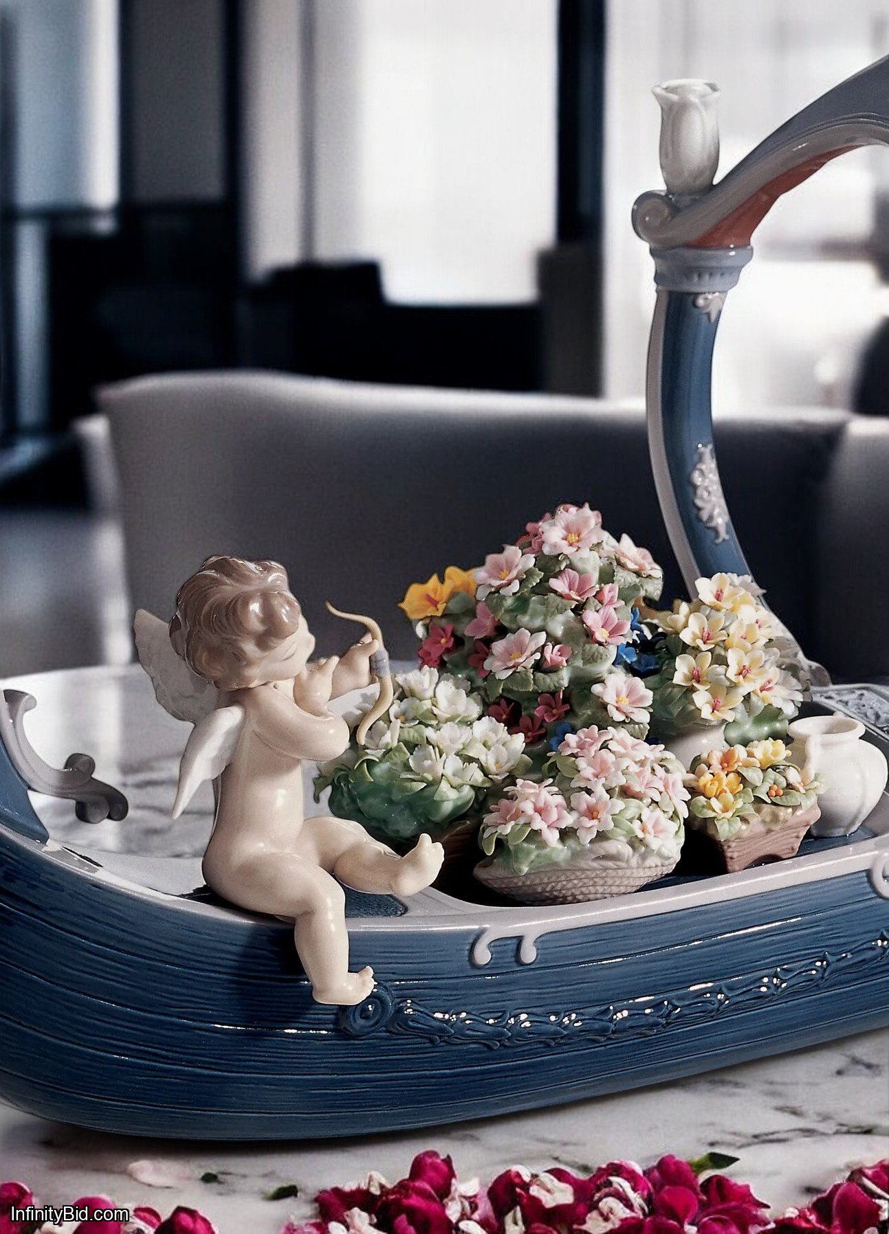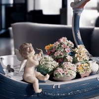 Accompanying her are two charming cupids: one drawing his bow with playful intention, the other guiding the vessel with a finely detailed wooden oar. The scene is enriched with soft pastel tones and an abundance of meticulously handcrafted porcelain flowers—each petal individually shaped by Lladró’s master artisans.