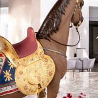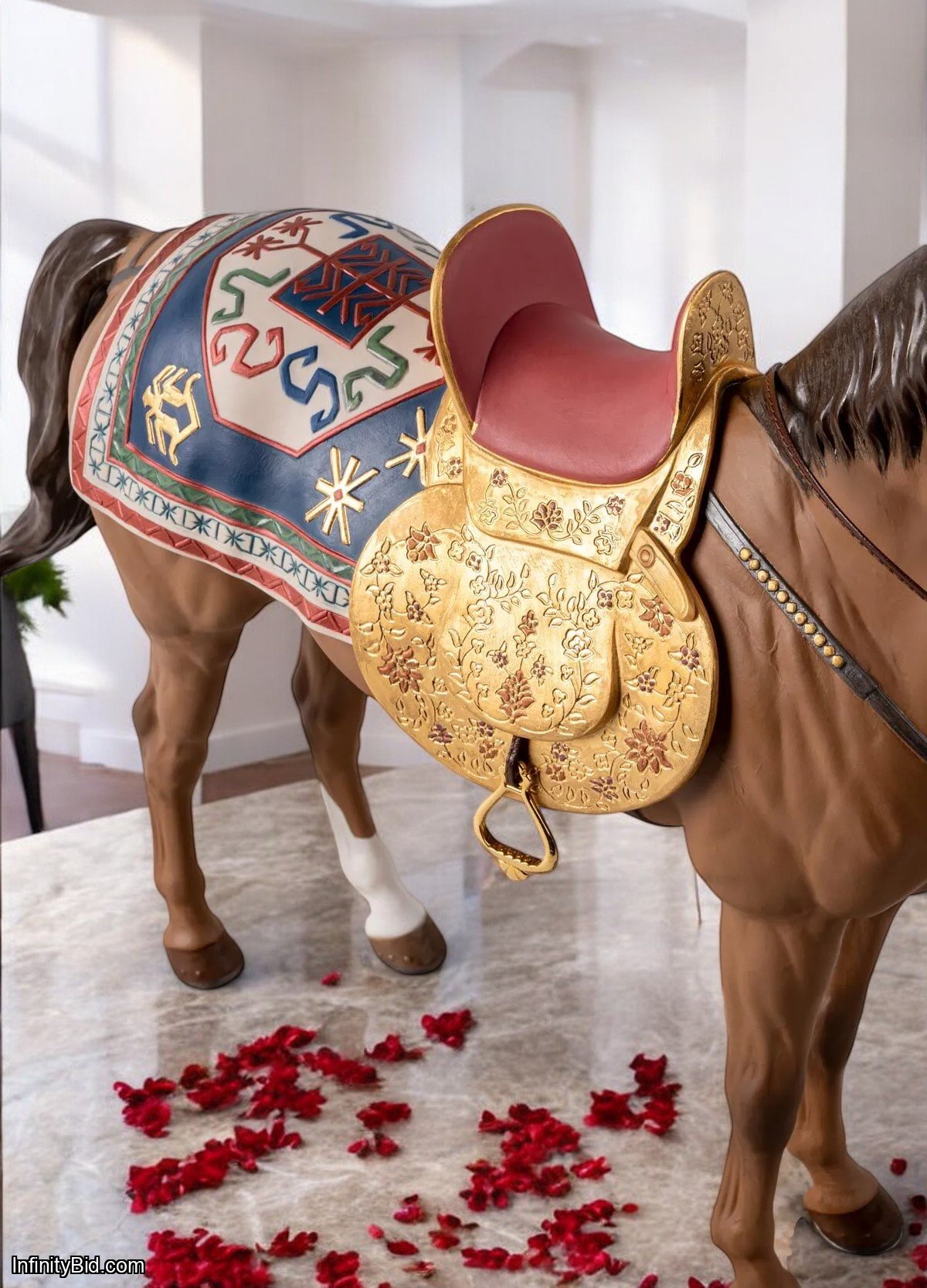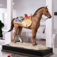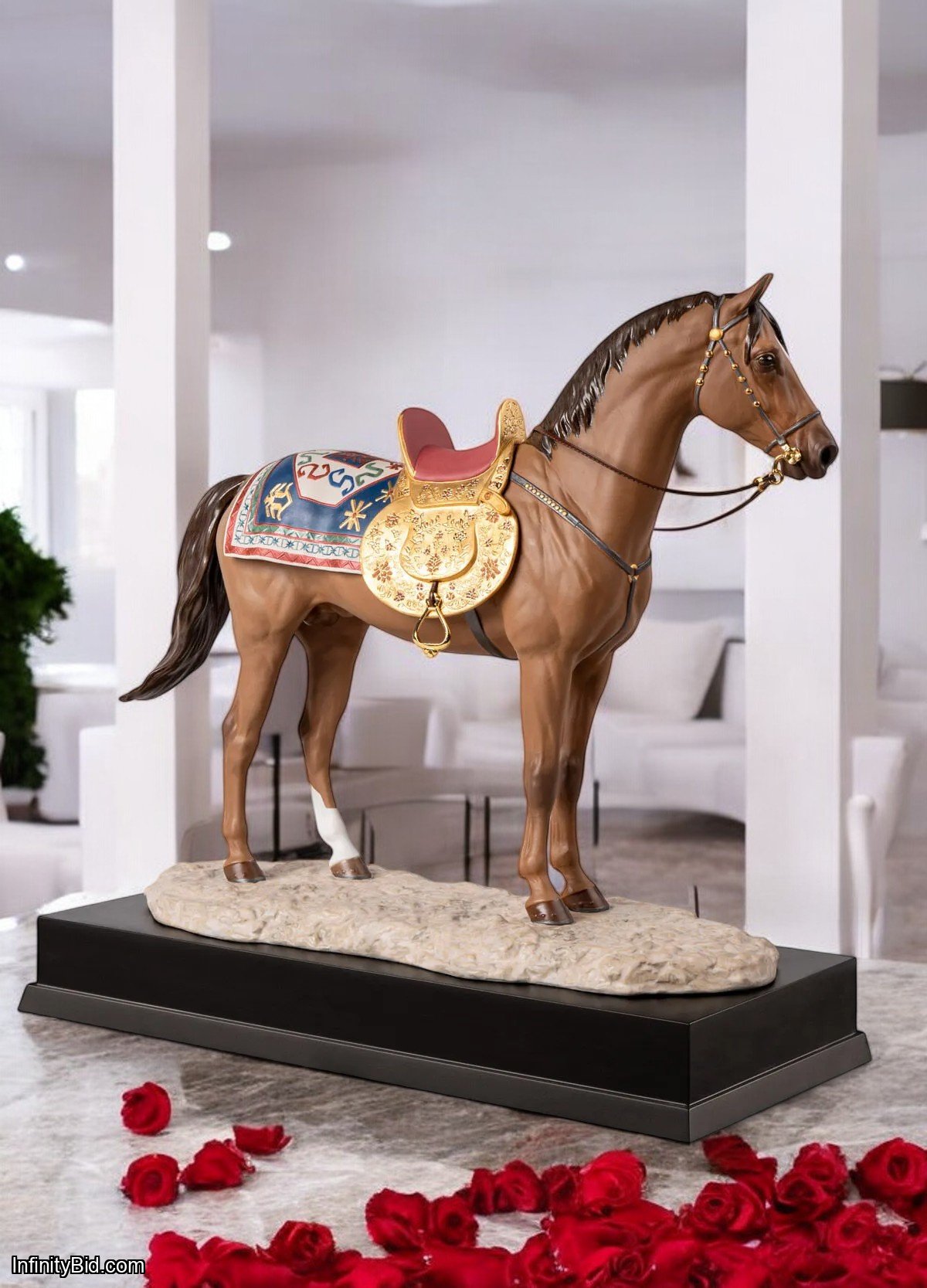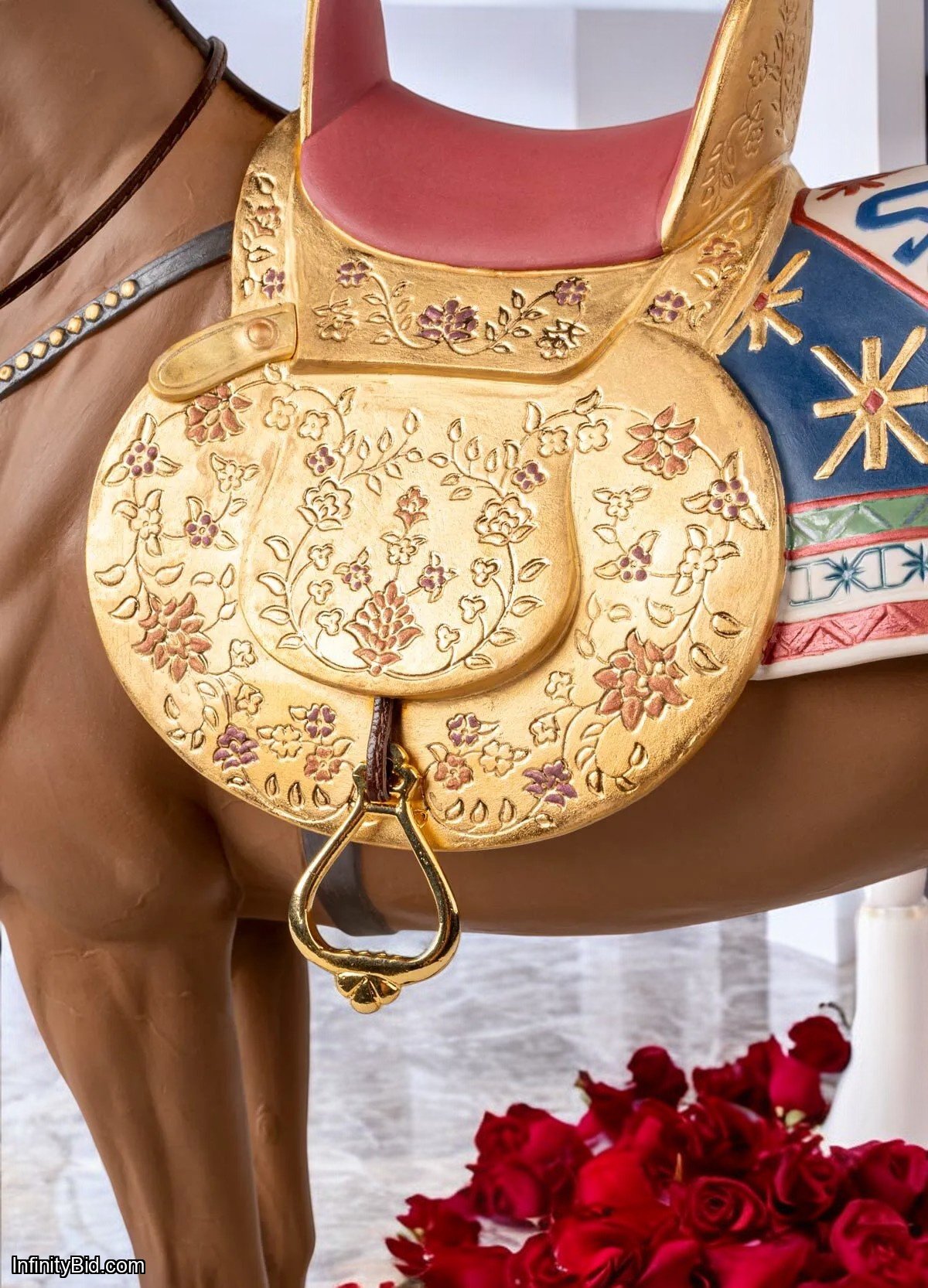 In homage to Azerbaijan's ancient traditions, the horse's back is adorned with a Karabakh carpet, showcasing its distinctive patterns in a rich blend of metallic reds, greens, blues, whites, and gold. The saddle, hand-etched with a delicate floral design, features golden luster, while a specially created dark copper brown enamel replicates the authentic color of these sorrel horses. The bit and stirrups are crafted from gold-plated brass, and the reins are made of natural leather, all meticulously designed to portray this powerful horse with undeniable elegance.