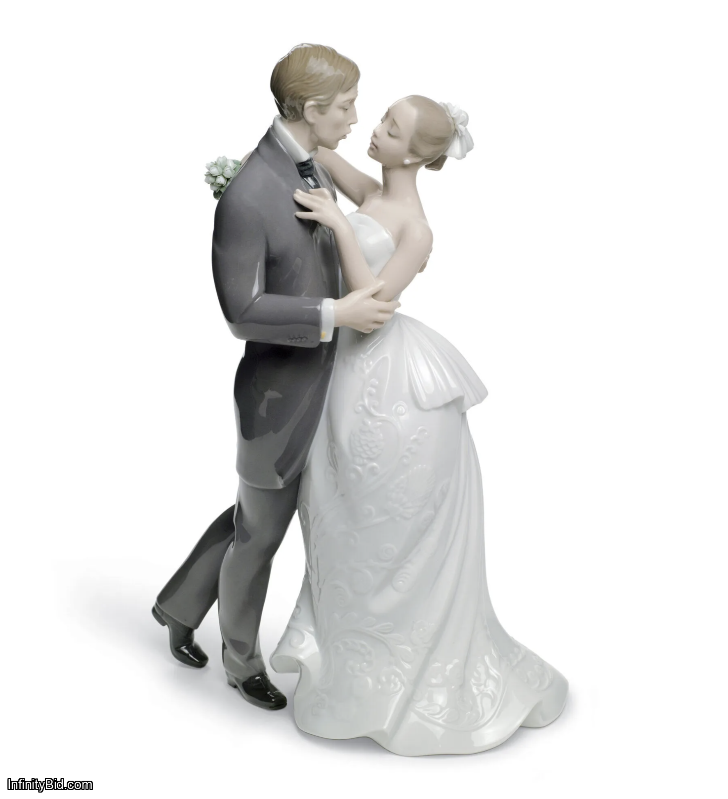 Lovers' Waltz captures the magic and elegance of newlyweds sharing their first dance—an unforgettable moment when all eyes turn to the couple as they glide gracefully across the floor. This beautiful porcelain figurine showcases the bride holding a delicate bouquet of roses while her dress features exquisite ornamentation, highlighted with soft details and flowing movement.