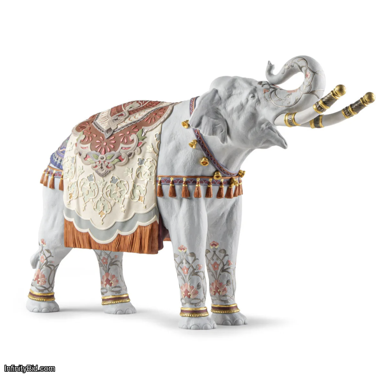 The decoration is one of the highlights of this work: over 20 carefully selected colors—including shades of orange, cobalt blue, emerald green, lavender, and rose—are hand-applied by Lladró’s expert artists. These tones blend beautifully with golden and iridescent lusters that enhance every contour and pattern. Garlands with golden bells and orange-tinted porcelain tassels complete the ornamental ensemble, adding movement and festive charm.