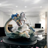 Sculpted by Alfredo Llorens, this large-scale composition portrays the decisive moment of Saint George’s victory, mounted on his noble white horse as he confronts the ferocious dragon. Executed in high-gloss porcelain, the sculpture displays a striking palette of green, blue, and white, masterfully balanced to heighten drama and movement.