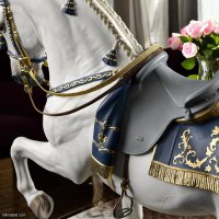 Meticulously handcrafted in matte white porcelain, this regal figure is enriched with metallic blue and 24K gold lustre accents on the bridle, saddle, and decorative blanket. Real gold-plated brass is used for the bite and stirrups, while natural leather details complete this masterpiece. Its proud pose, trotting with grace and poise, makes it a centerpiece in any fine porcelain or equestrian art collection.