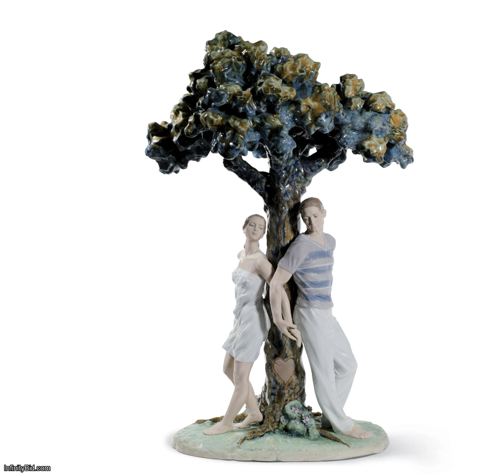 Crafted in glossy porcelain, the sculpture showcases Lladro’s signature soft lines, serene expressions, and elegant movement. The tree’s flowing form and the couple’s embrace create a harmonious composition that radiates warmth and romance.