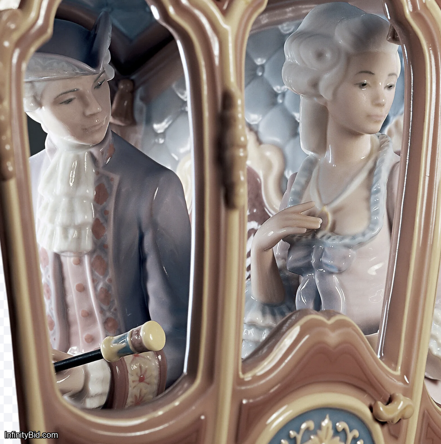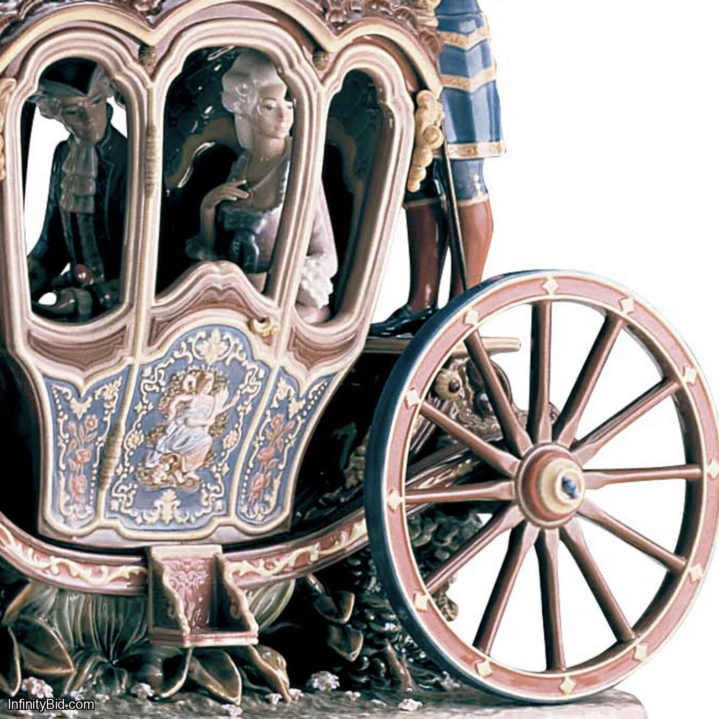 Inspired by the historic royal coaches preserved at the Coach Museum in Lisbon, this sculpture translates aristocratic grandeur into porcelain art. Every element is executed with obsessive attention to detail - from the richly ornamented carriage and finely dressed noble couple to the servants’ uniforms, harnesses, and the dynamic movement of the horses.