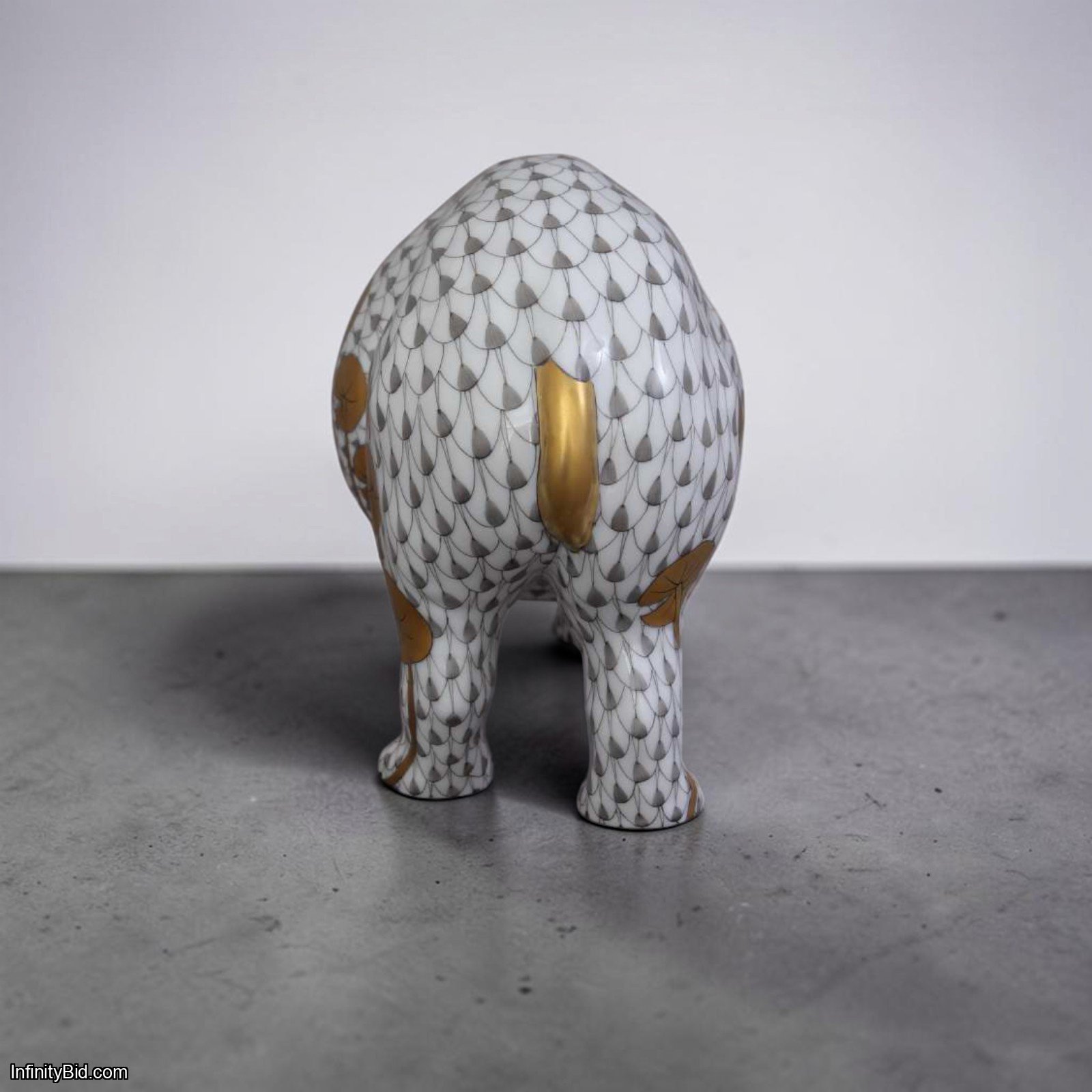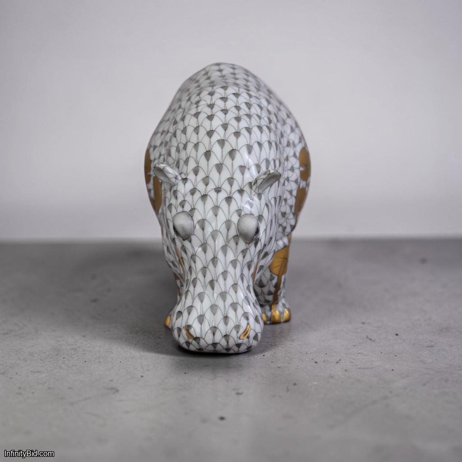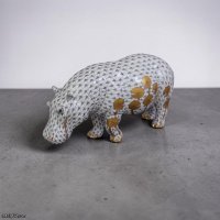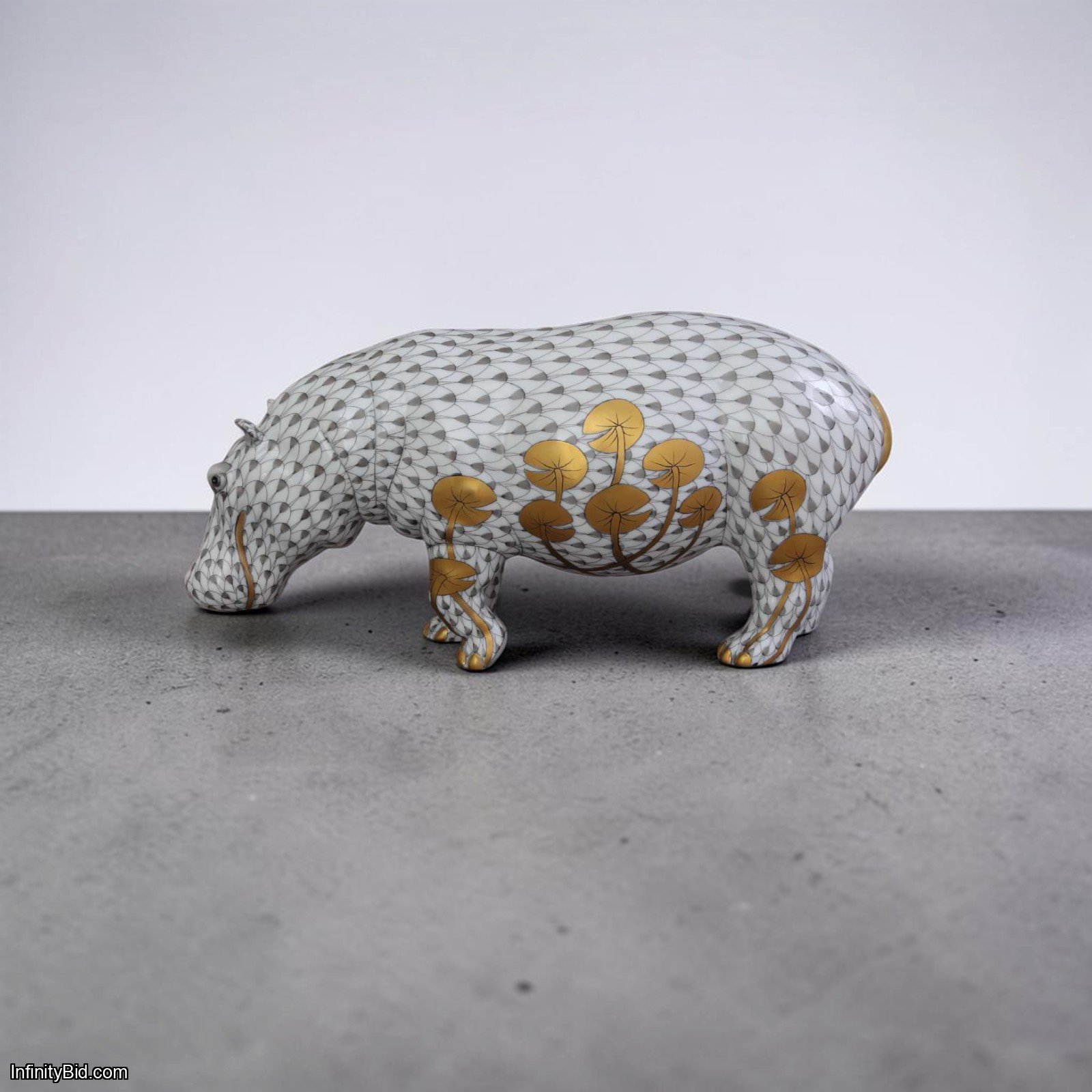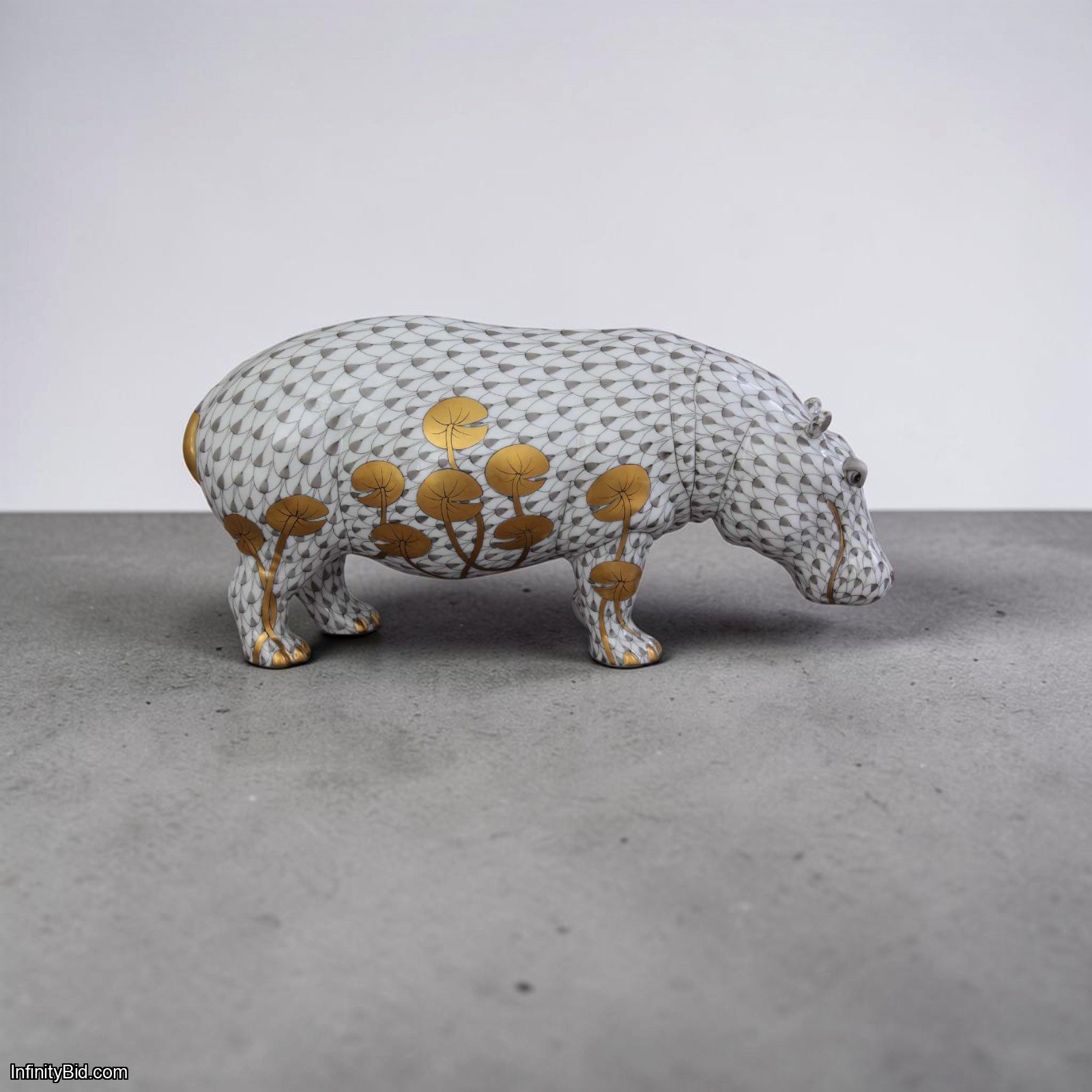 Herend's master artists have created something truly magical here: the hippo is rendered in the iconic grey fishnet (VHSP117) pattern, and across his body cascade hand-painted 24k gold water lily pads, creating the enchanting illusion that this magnificent creature is wading through his beloved aquatic home. The gold hooves and fine detailing throughout speak to the extraordinary level of craftsmanship that has made Herend the choice of royalty and collectors for nearly 200 years.