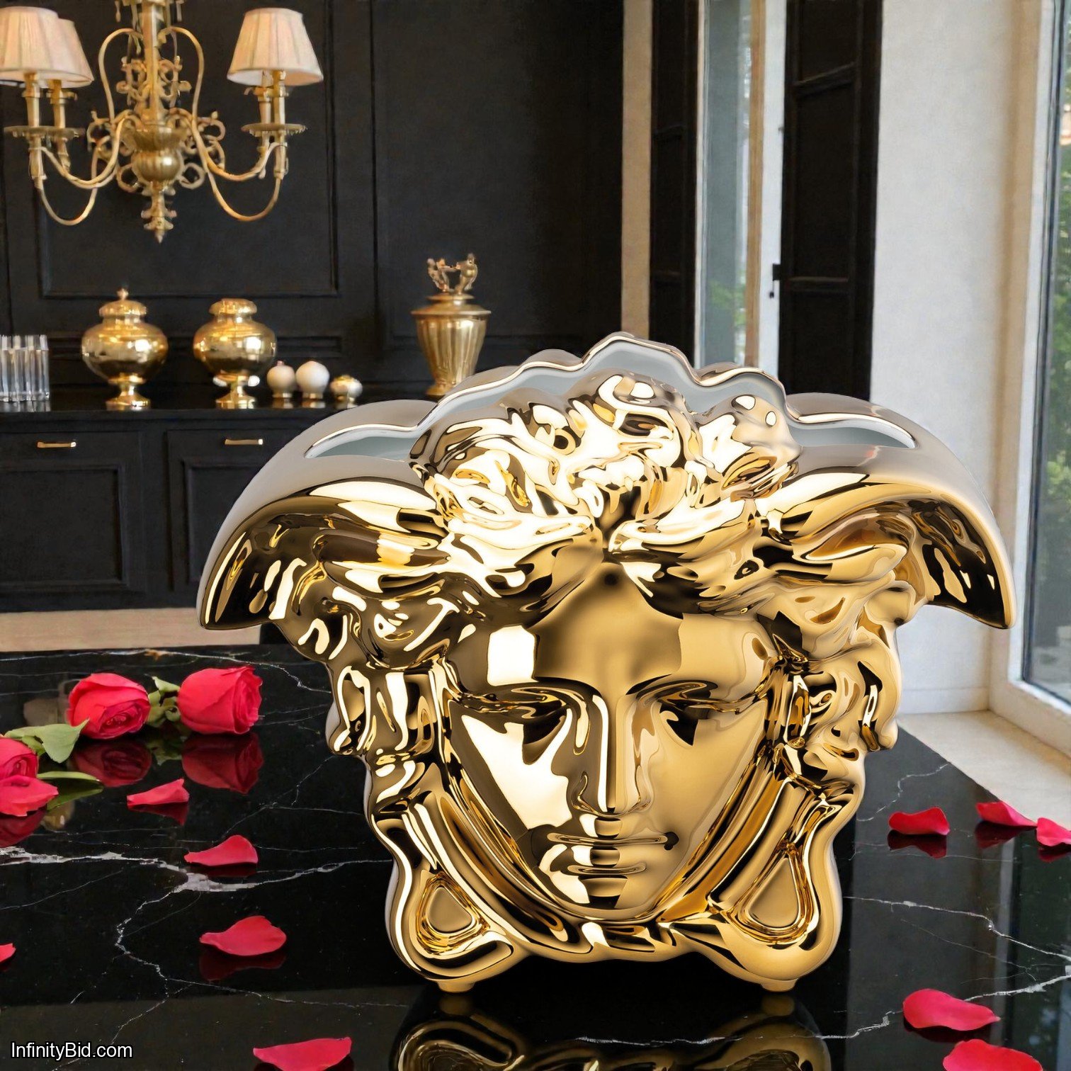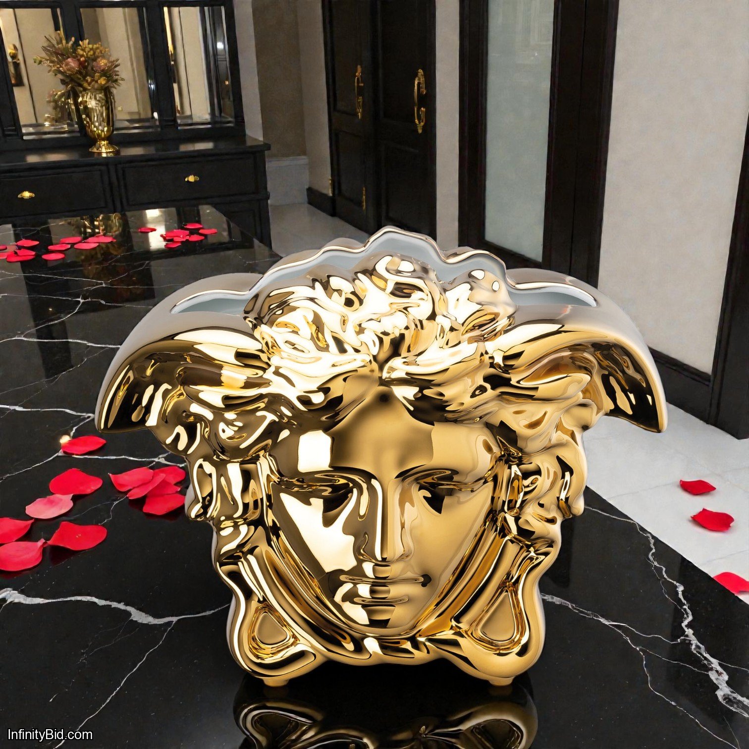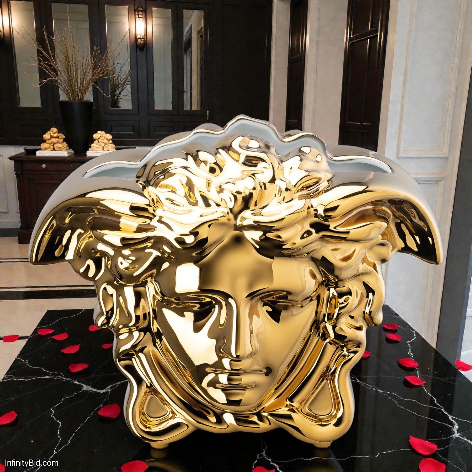 An icon of luxury and timeless elegance, the Versace Medusa Grande Gold Vase embodies the bold aesthetic and refined craftsmanship that define the Versace legacy. Crafted from fine porcelain and adorned with opulent gold décor, this sculptural vase features the legendary Medusa motif—an unmistakable symbol of power, beauty, and prestige.